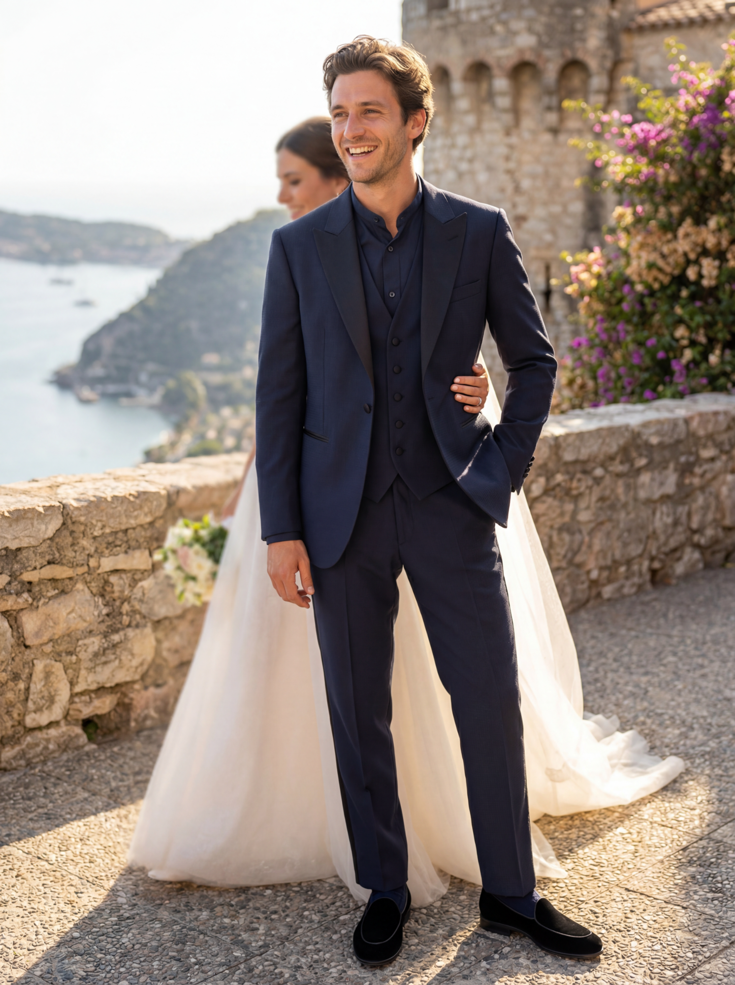 Abiti da sposo e capi formali realizzati con approccio sartoriale, spalle naturali e una vestibilità distintiva.