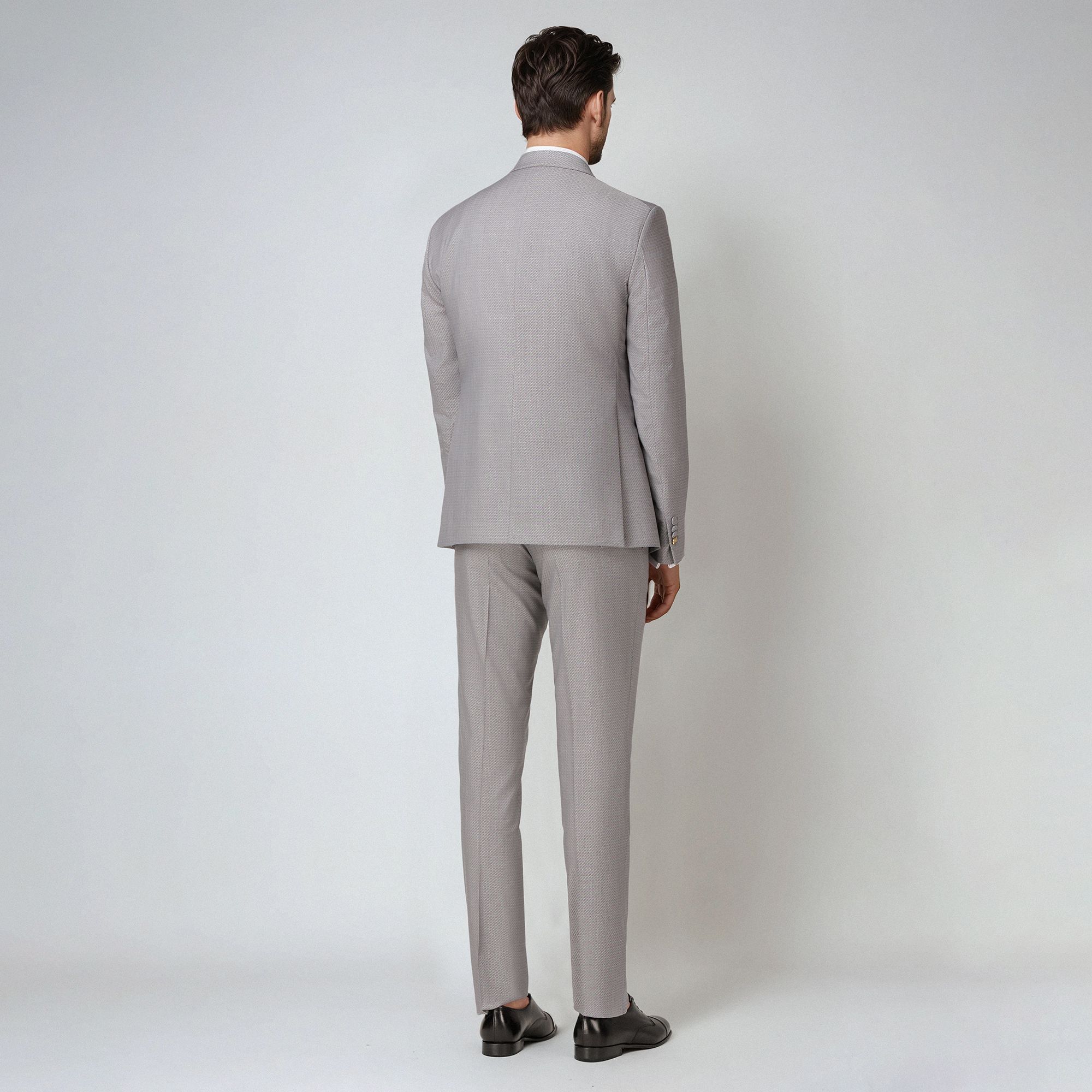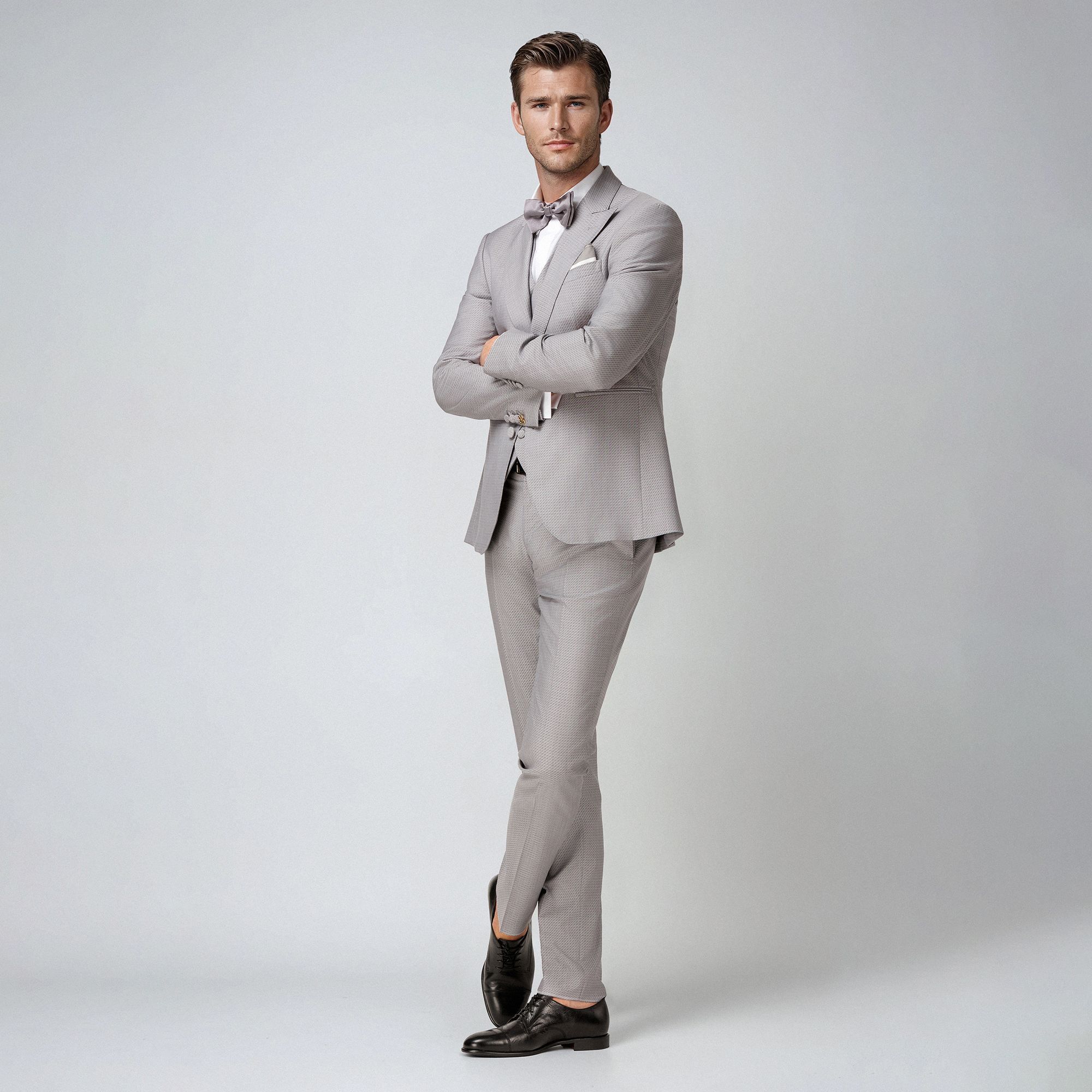 Pensato per eventi raffinati e cerimonie, questo abito tre pezzi grigio è realizzato in jacquard di lana e seta, creando un effetto discreto ma sofisticato. La vestibilità Bristol enfatizza una silhouette strutturata, offrendo massima eleganza e comfort.