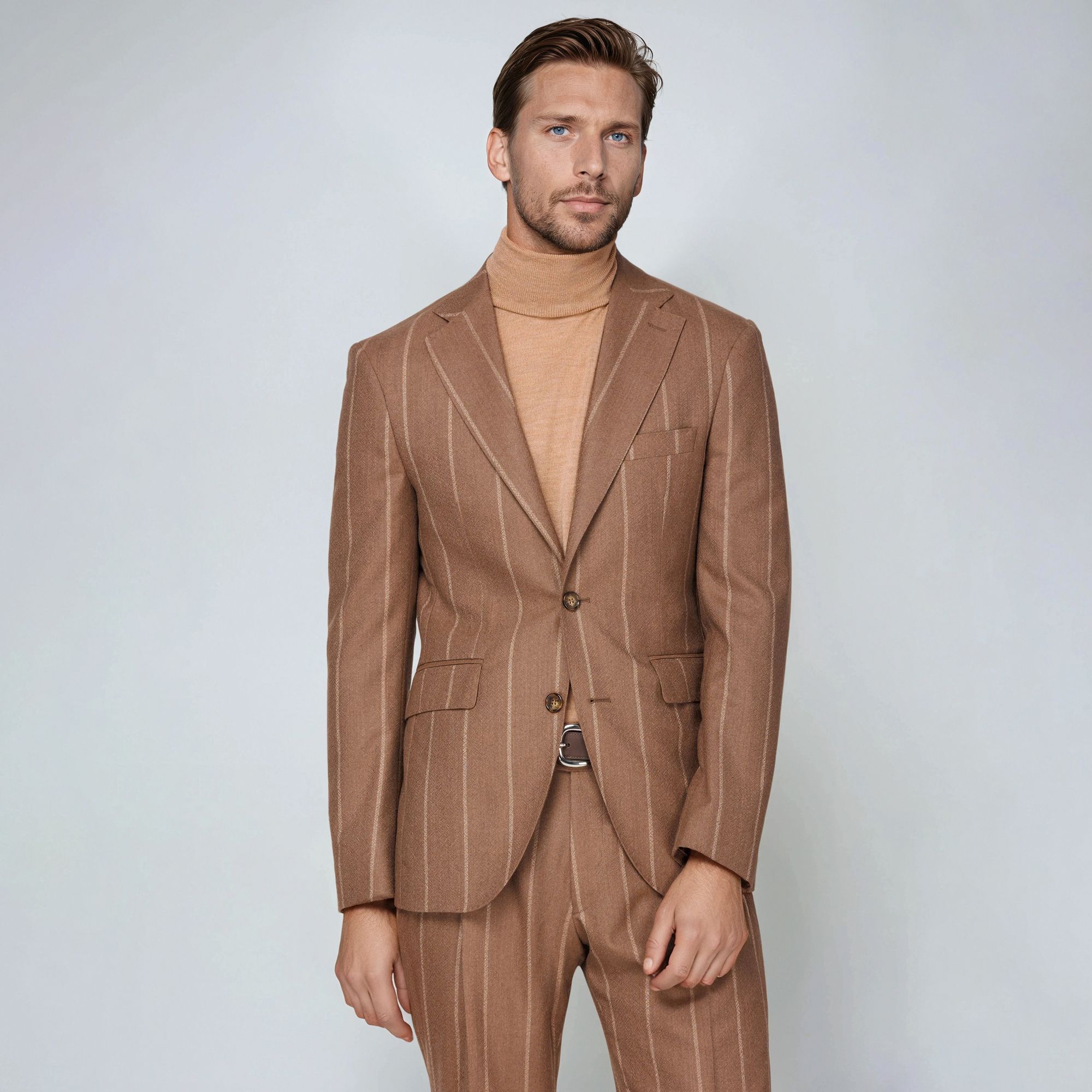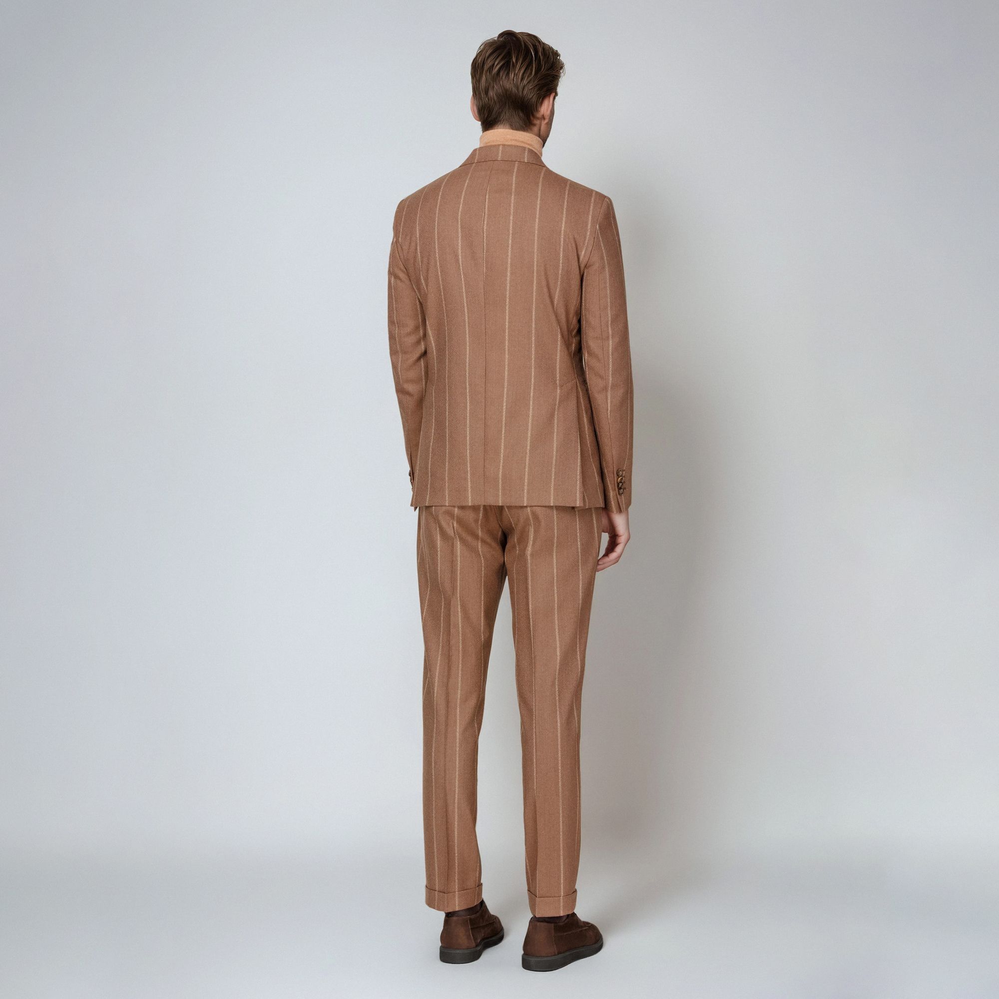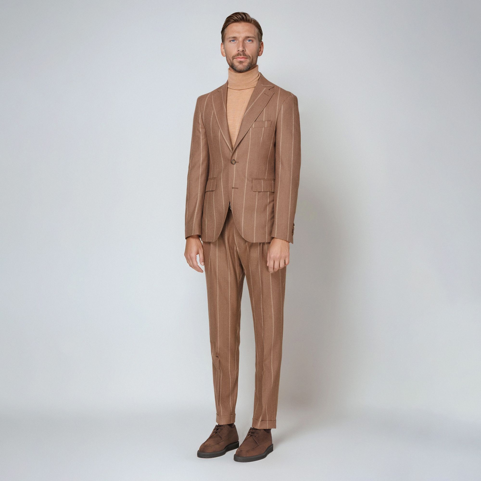 Un abito a righe distintivo in flanella leggera di lana vergine elasticizzata, con mano morbida e caduta fluida. La giacca monopetto due bottoni presenta spalle naturali, costruzione destrutturata e semifoderata, impuntura AMF e asole funzionanti. I pantaloni, con piega singola e risvolti, sono foderati internamente per comfort superiore: un equilibrio tra praticità quotidiana e raffinatezza per ambienti business e semi-formali in ogni stagione. Tessuto e confezione Made in Italy.
