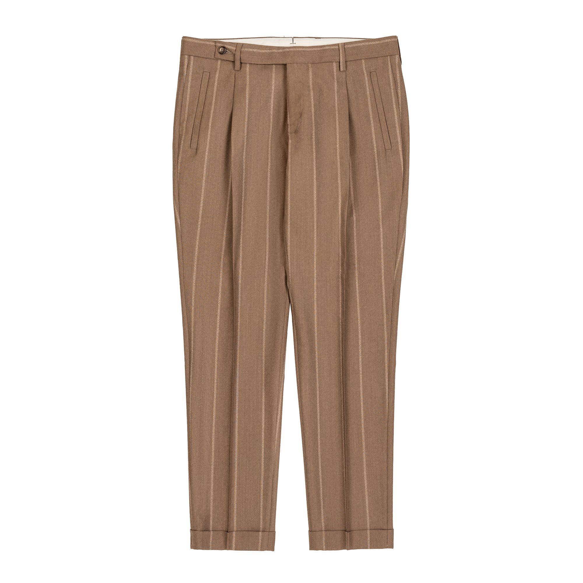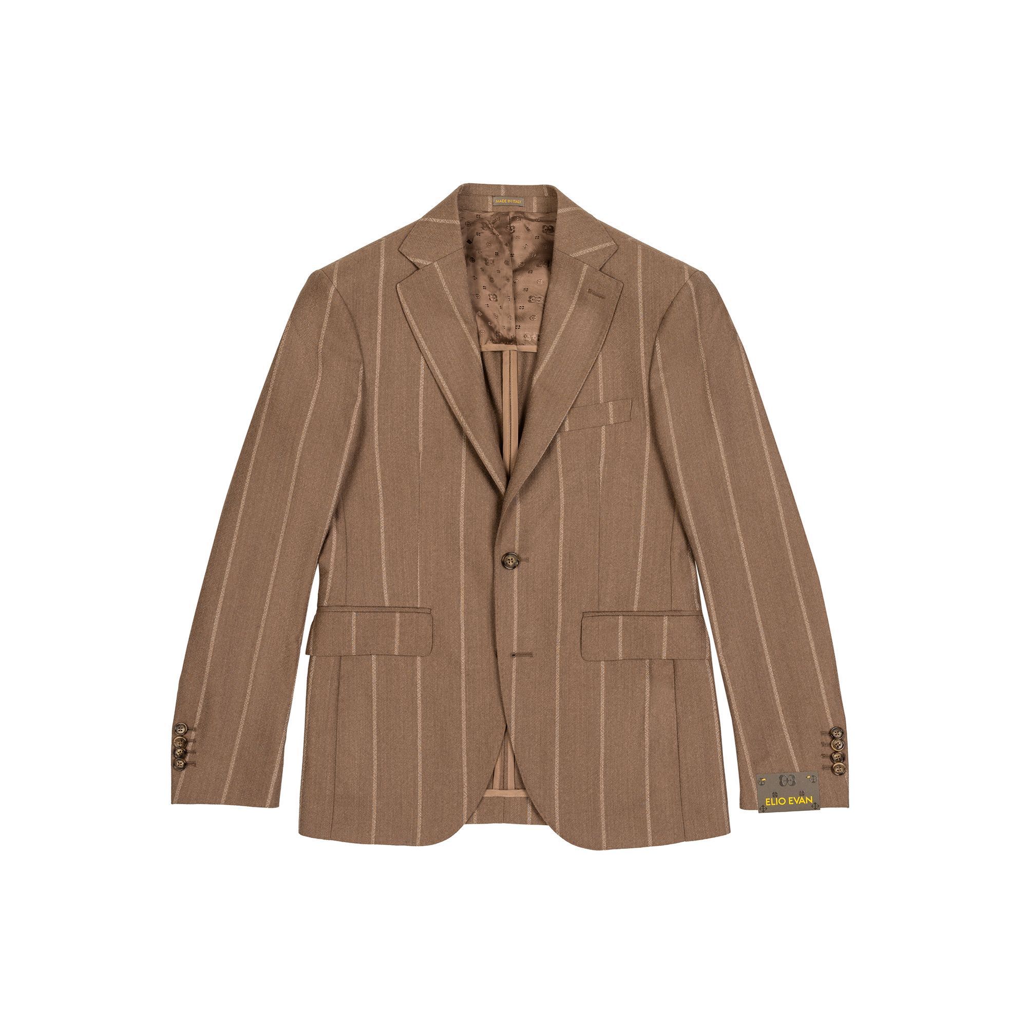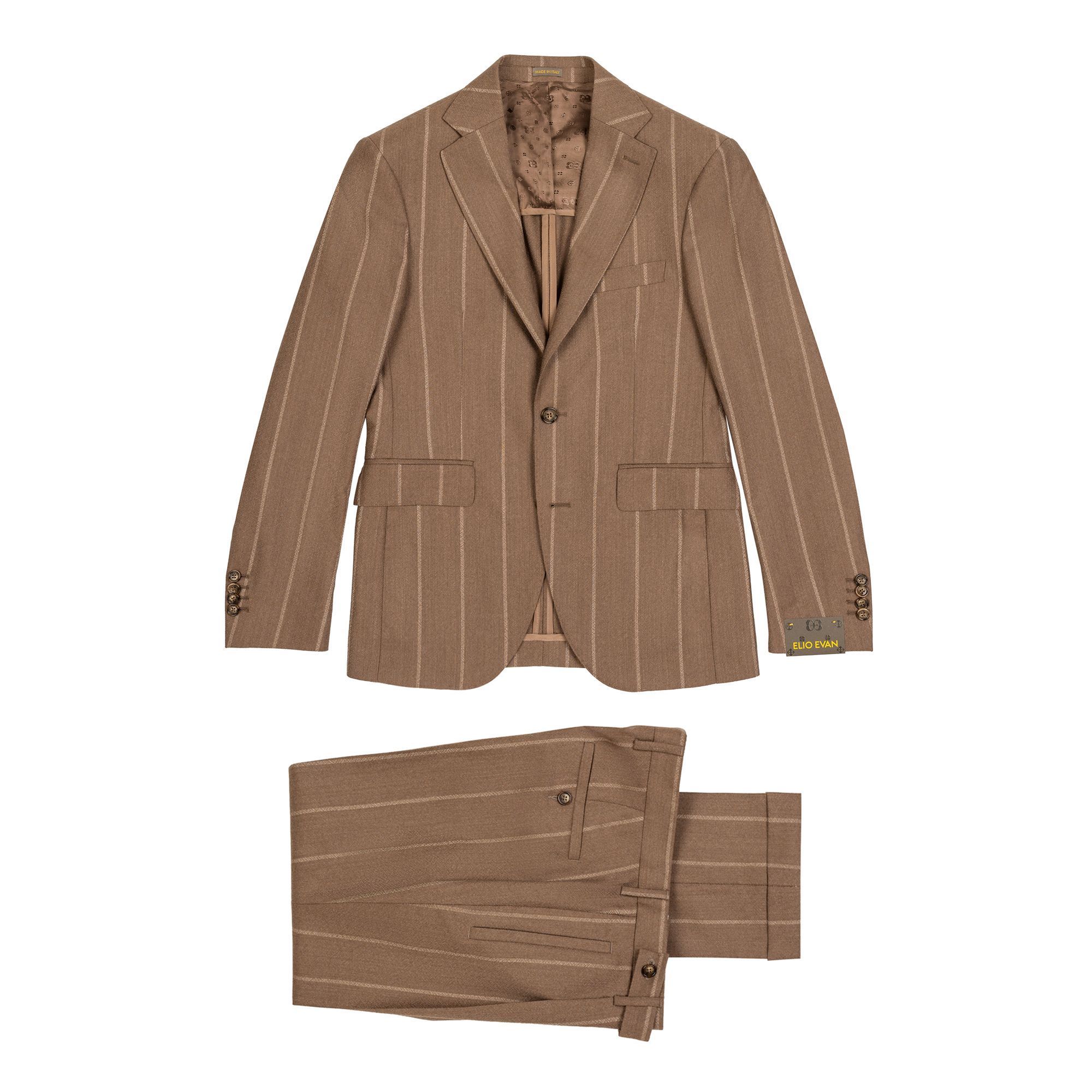 Un abito a righe distintivo in flanella leggera di lana vergine elasticizzata, con mano morbida e caduta fluida. La giacca monopetto due bottoni presenta spalle naturali, costruzione destrutturata e semifoderata, impuntura AMF e asole funzionanti. I pantaloni, con piega singola e risvolti, sono foderati internamente per comfort superiore: un equilibrio tra praticità quotidiana e raffinatezza per ambienti business e semi-formali in ogni stagione. Tessuto e confezione Made in Italy.