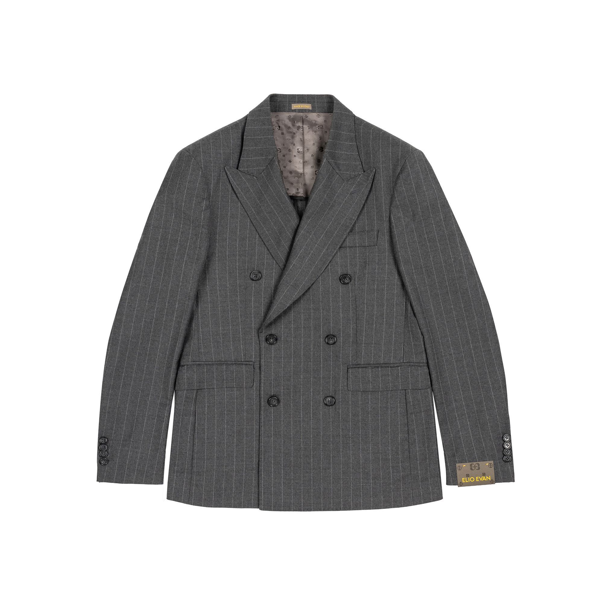 Elegante giacca doppiopetto da uomo in lana vergine elasticizzata con motivo gessato grigio, realizzata nel modello Vomero DP, simbolo dell’equilibrio tra sartorialità italiana e modernità firmato Elio Evan. Le linee naturali e scolpite seguono armoniosamente il corpo, mentre il tessuto opaco e soffice esprime sobria eleganza. Revers a lancia con impuntura AMF, abbottonatura sei su due e mezza fodera con motivo firmato completano un capo di raffinata personalità. Disponibili i pantaloni coordinati per completare l’abito.