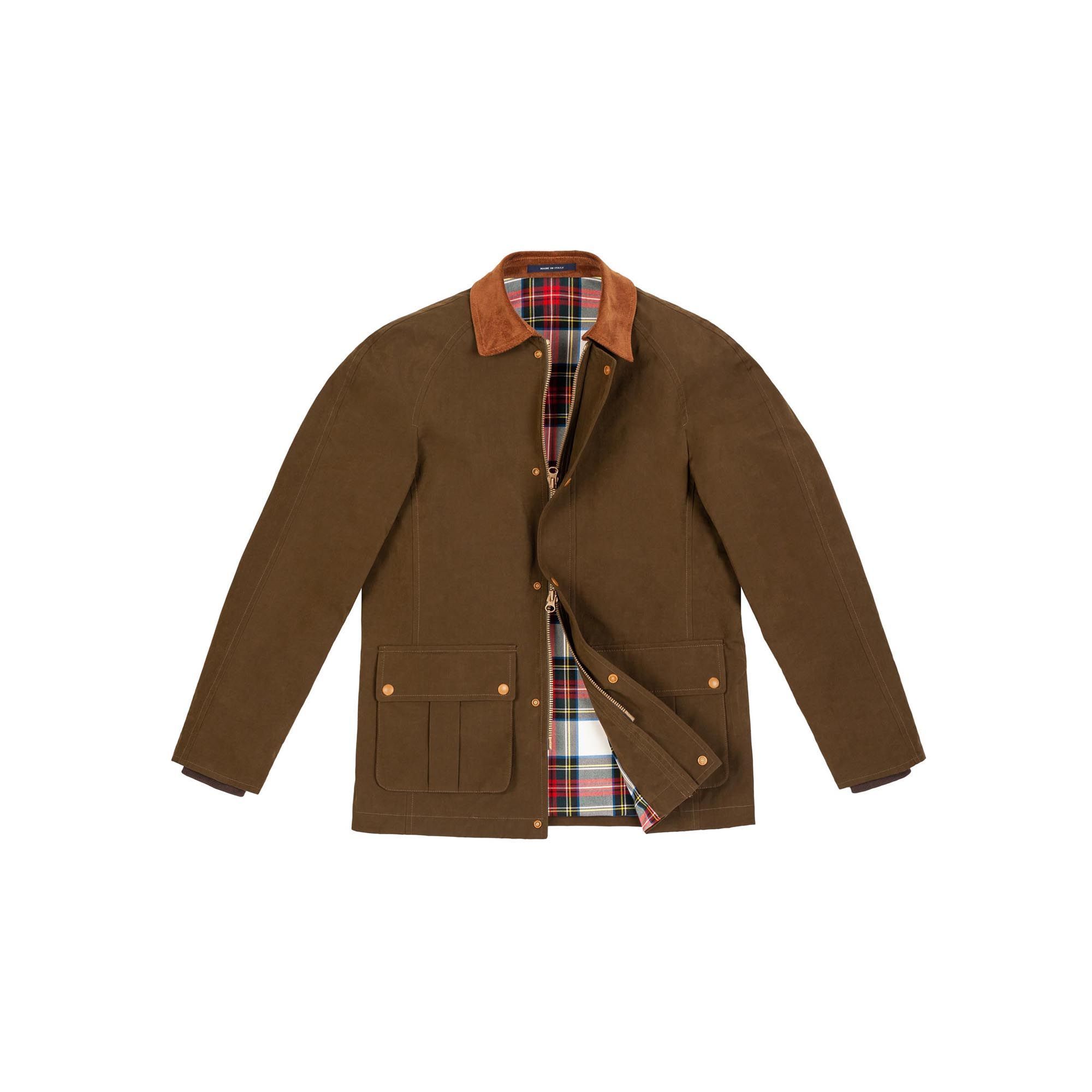 Questa giacca è realizzata in un tessuto tipo cerato con una sensazione naturale, arricchito da un rivestimento in resina per creare una barriera antivento e impermeabile, rendendola perfetta per inverni miti e mezza stagione. L'interno è completamente foderato con una fodera pesante in tartan, garantendo calore e comfort. Il design include una chiusura con cerniera a doppio cursore, bottoni automatici, polsini nascosti a maglia e un colletto in velluto a coste di cotone. Con i suoi dettagli pratici ma eleganti, tra cui le spalle raglan e le tasche a toppa, questa giacca è un'aggiunta essenziale a qualsiasi guardaroba esigente.