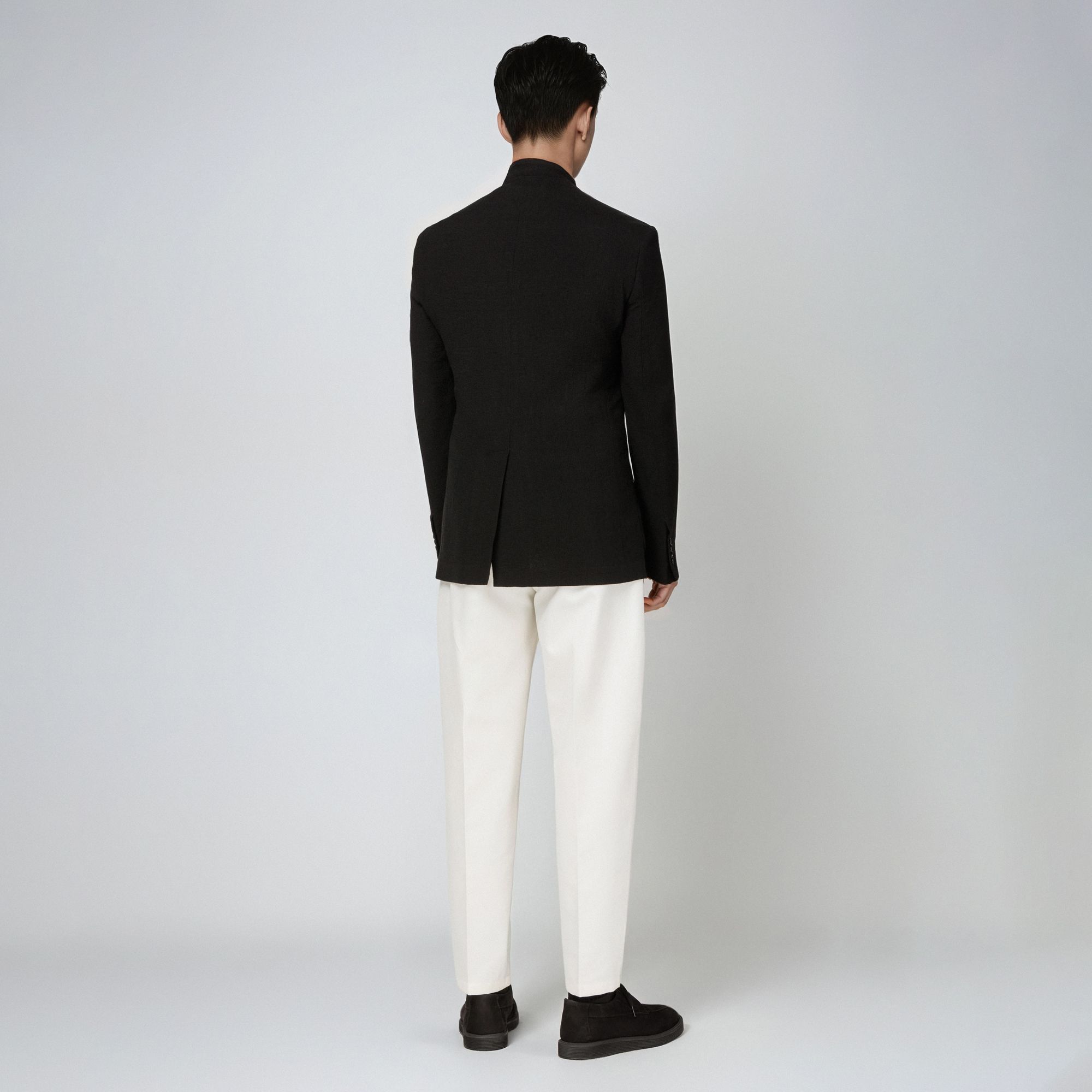 Elegante giacca destrutturata da uomo realizzata in tela di lana vergine a maglia, con la ricchezza tattile di un tessuto compatto e una linea fluida. Il modello Coreana presenta collo alla coreana, costruzione semifoderata e spacco singolo posteriore, combinando comfort e precisione. Tasche applicate, asole funzionanti e cuciture bordate interne sottolineano la maestria sartoriale contemporanea di Elio Evan. Un capo iconico delle silhouette della Maison — fluido, architettonico e modernamente essenziale.