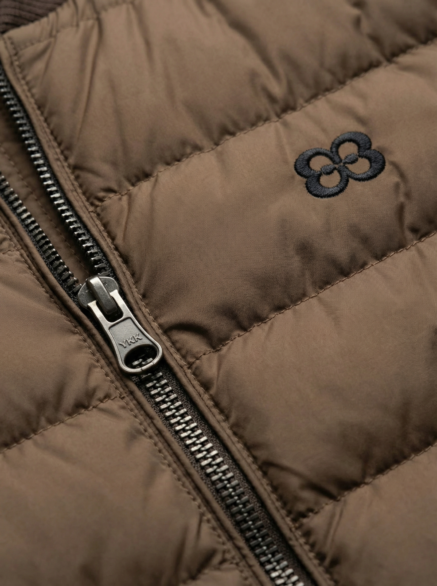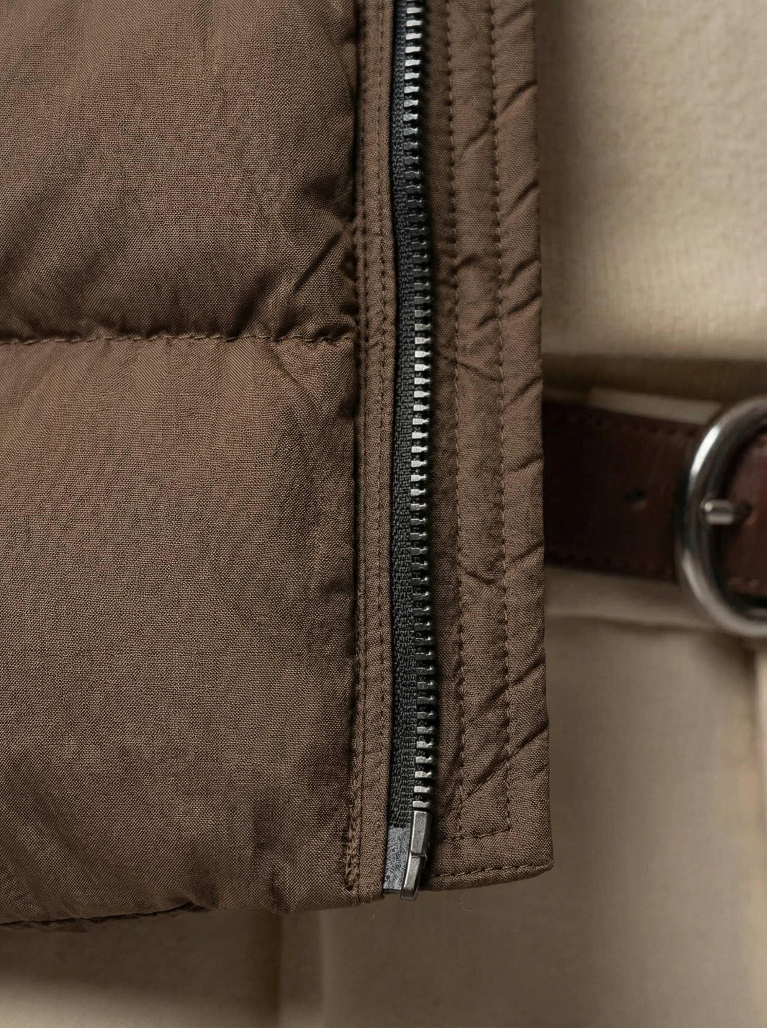 La zip YKK a doppio cursore, il fondo regolabile internamente e le tasche interne dedicate completano un capo dove la funzionalità diventa dettaglio di stile.