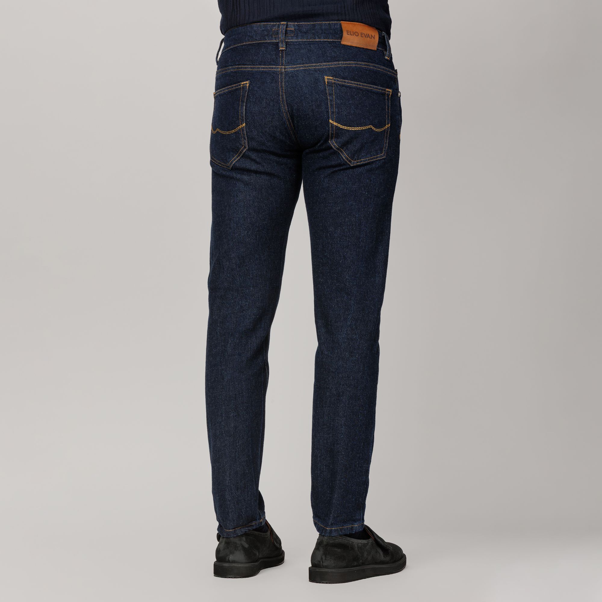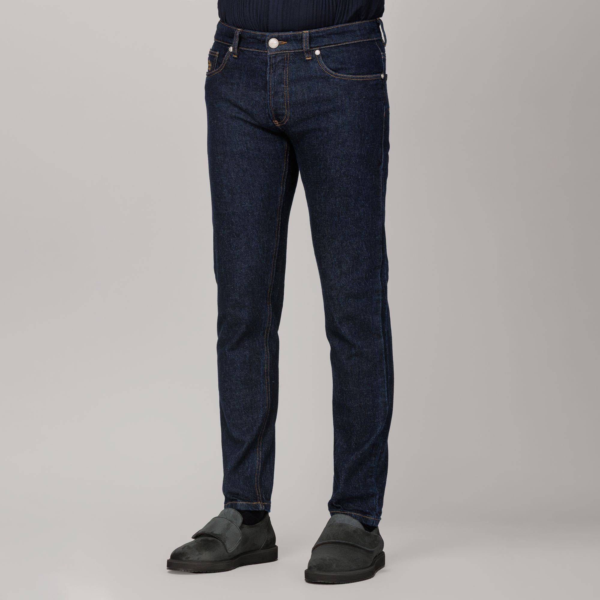 Un essenziale contemporaneo plasmato con la precisione della sartoria italiana. Realizzati in denim blu intenso pieno colore, questi jeans presentano una superficie compatta e una lucentezza naturale che si evolve nel tempo. Il modello Soho, con vestibilità slim e vita regolare, è arricchito da patch in pelle, ricami tono su tono e bottoni in nichel opaco, per un’eleganza discreta ma distintiva.