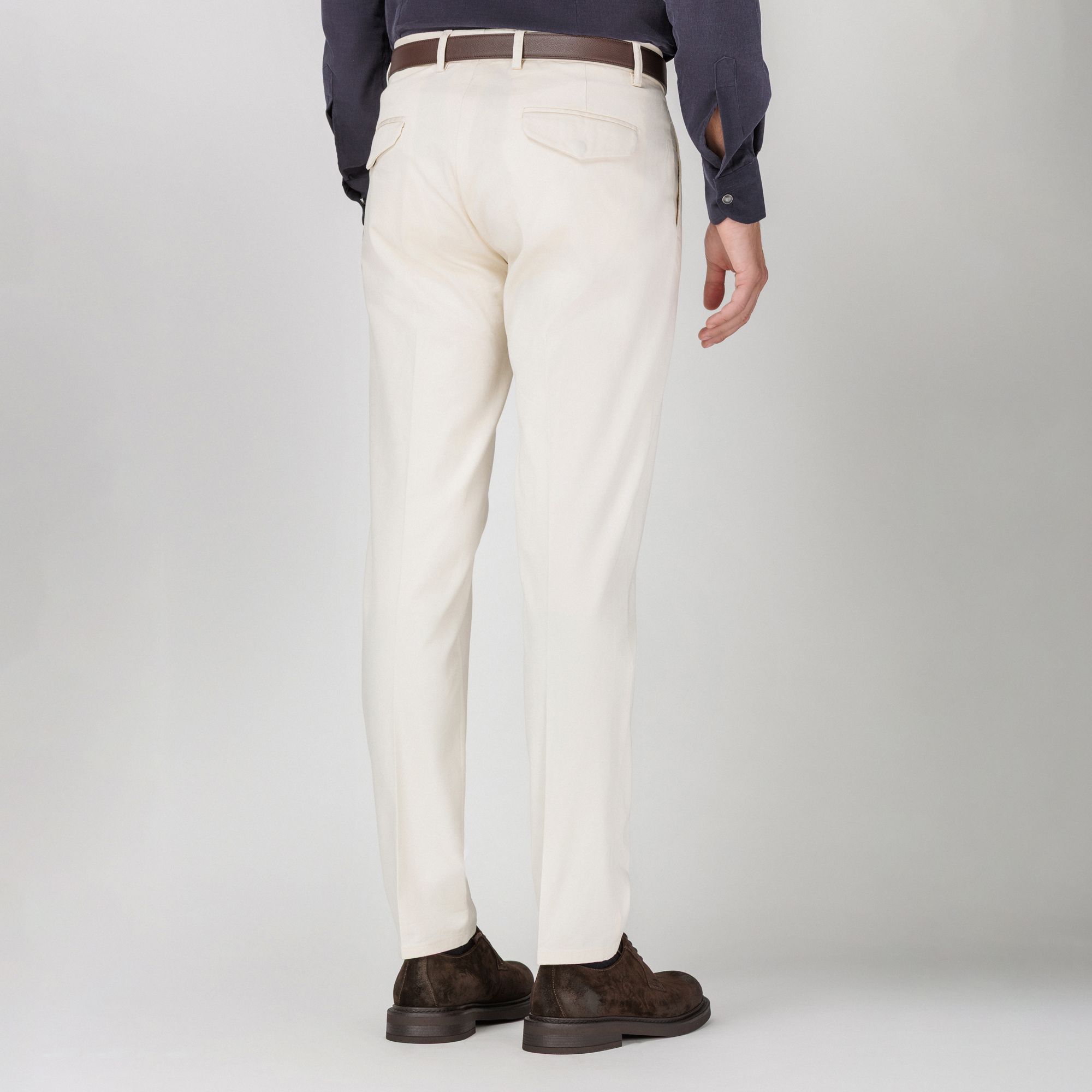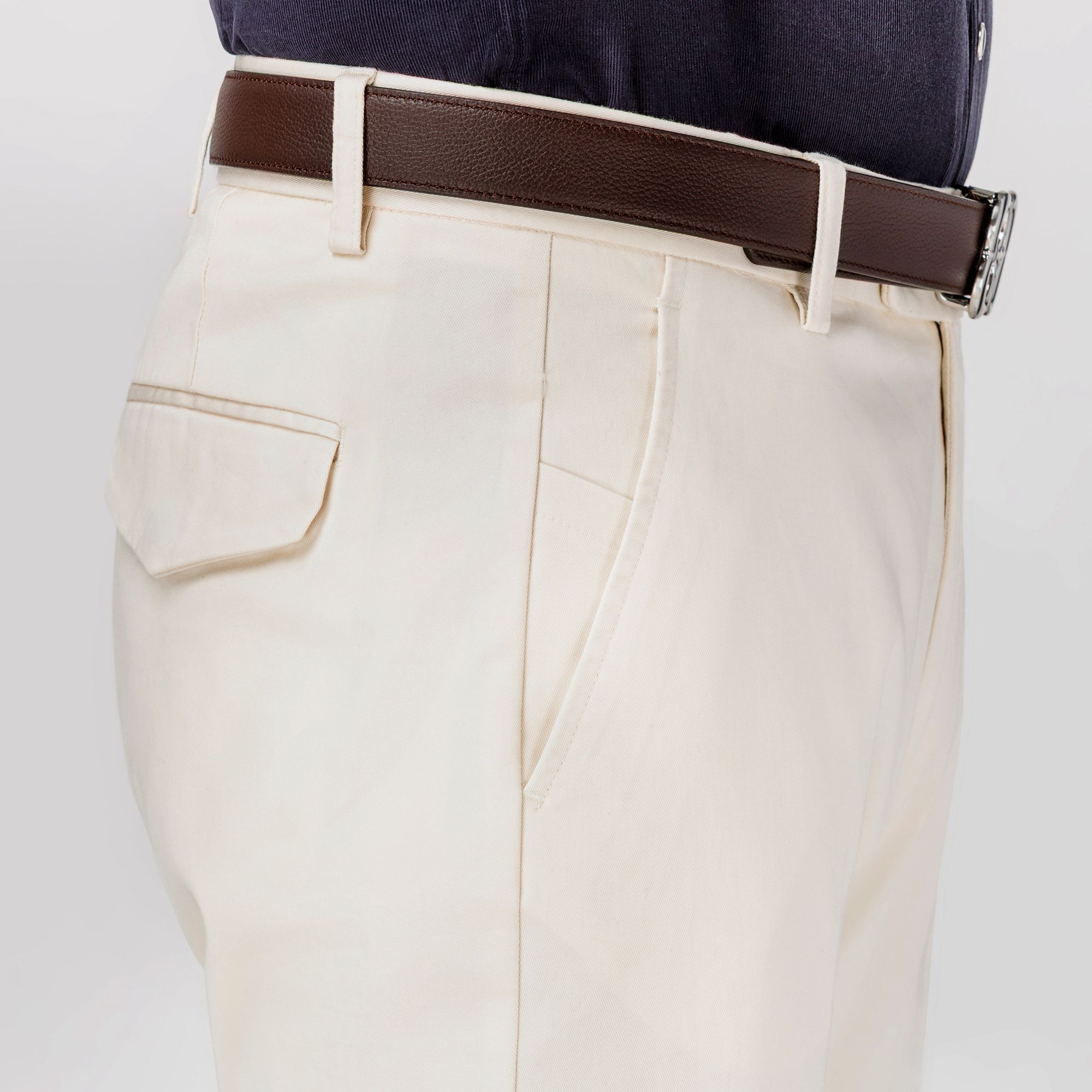 L’atelier Elio Evan presenta un pantalone chino color crema che unisce eleganza e comfort per look smart-casual versatili. Realizzato in cotone stretch a trama drill con finitura lavata, offre una mano morbida mantenendo la precisione della silhouette. La cintura con linguetta estesa, le tasche laterali oblique e le tasche posteriori con pattina e bottone a pressione assicurano stile e funzionalità. La calzata impeccabile lo rende un capo intramontabile.