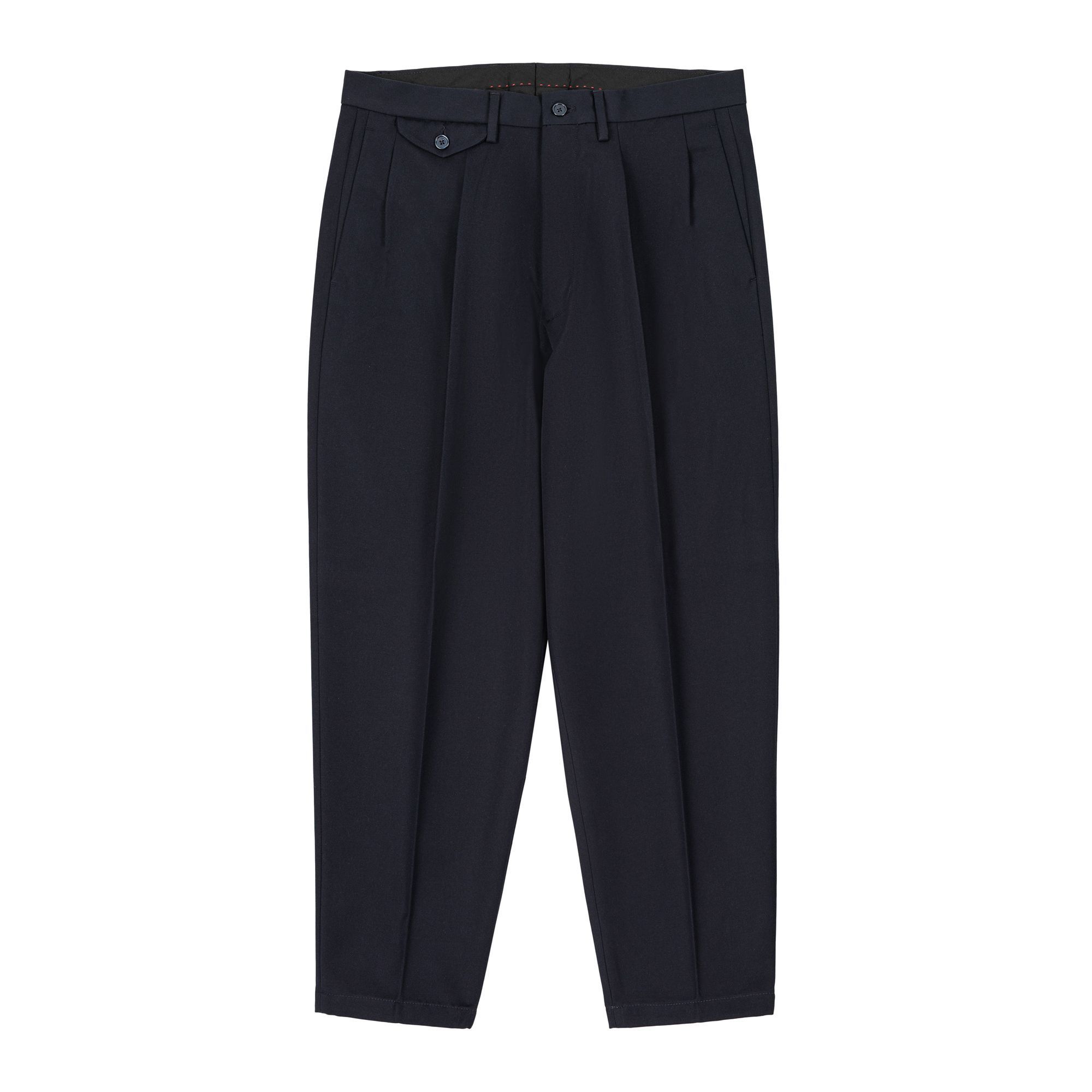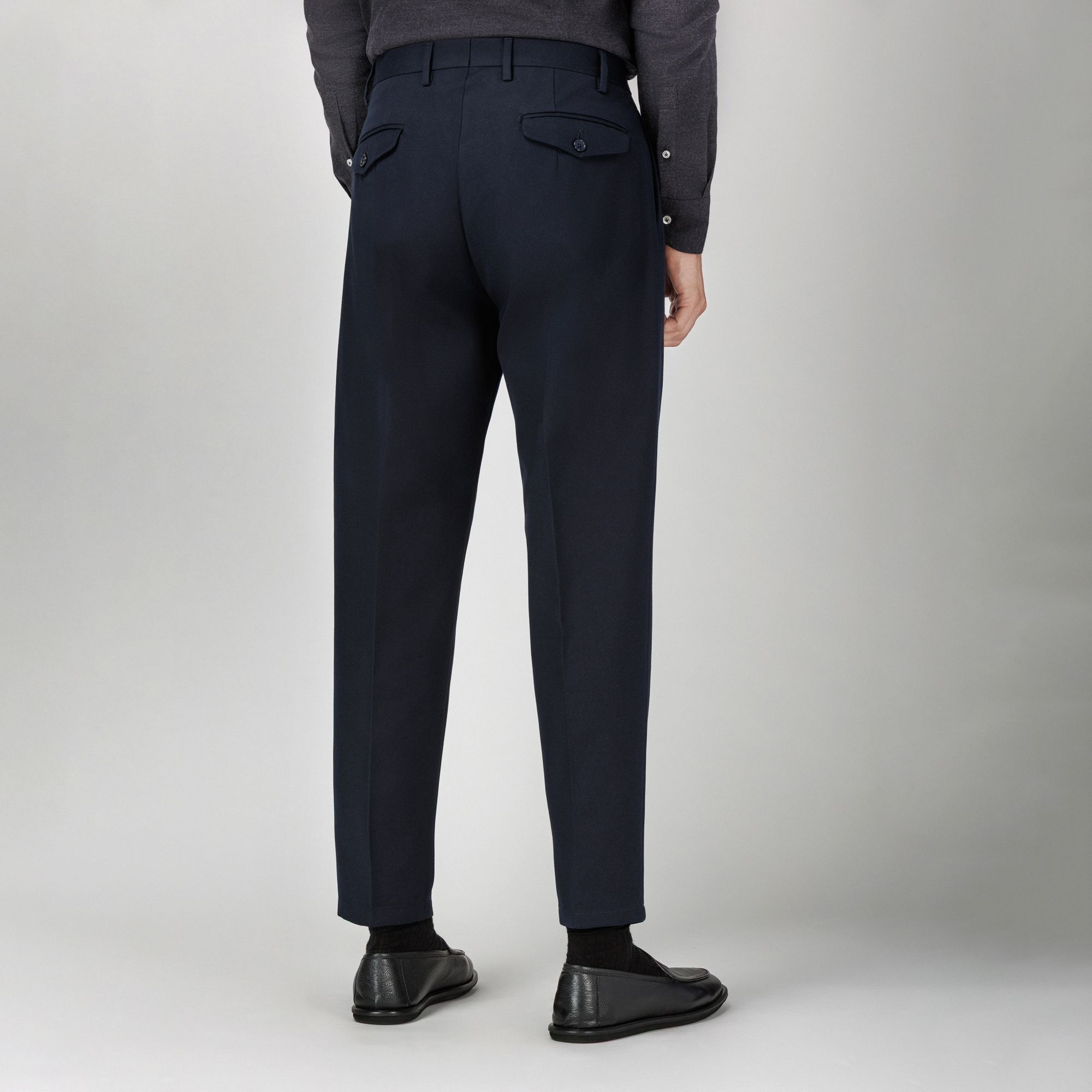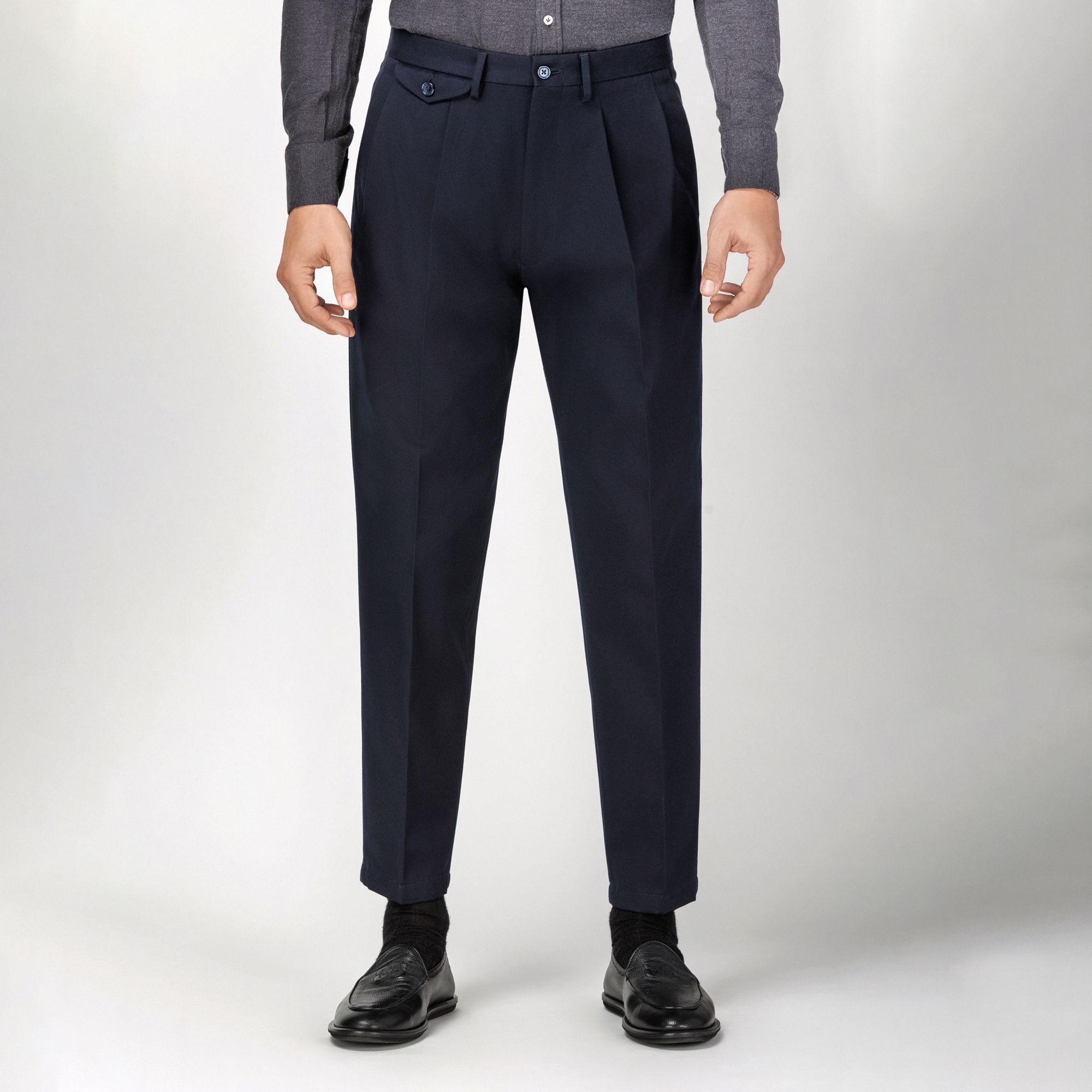 Realizzati in una miscela di lana vergine e cotone Pima con tessitura twill, questi pantaloni blu navy offrono resistenza alle pieghe, traspirabilità e caduta impeccabile. Il modello Japan propone una silhouette moderna con gamba larga, doppia pence e lunghezza cropped con fondo affusolato.