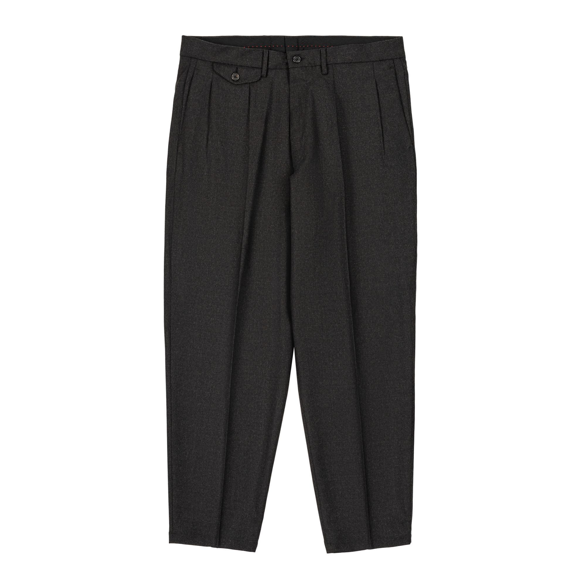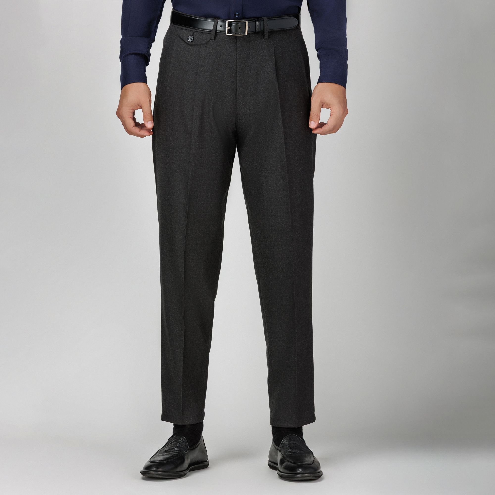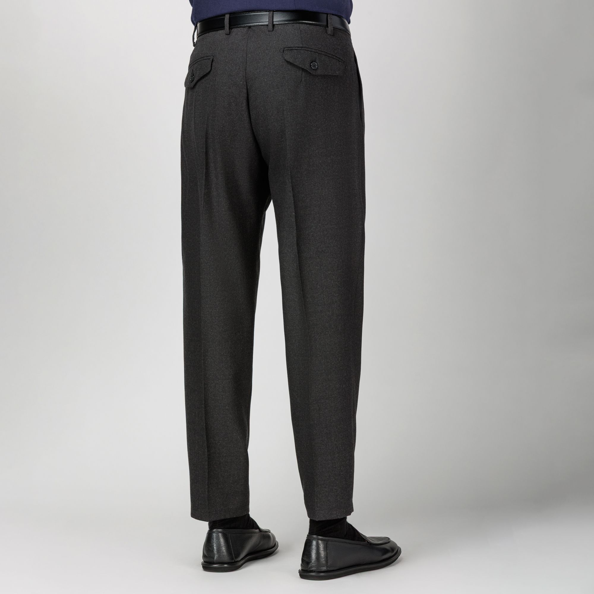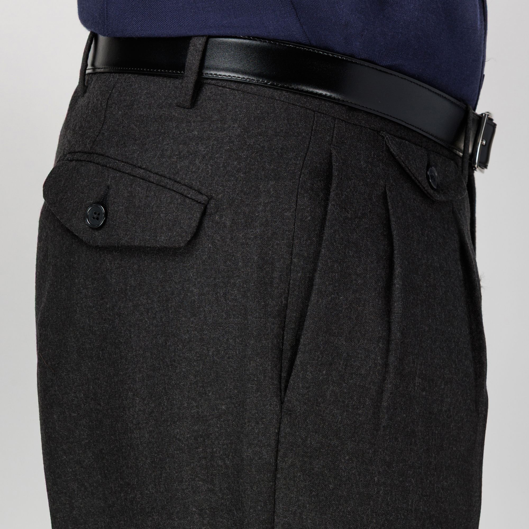 Pantaloni da uomo in flanella di lana mista, con vestibilità ampia e doppia pince. Modello Japan con tasche a pattina anteriori e posteriori e fondo pulito. Un blend lavabile e resistente alle pieghe che unisce eleganza e comfort, seguendo la filosofia Elio Evan di una calzata impeccabile.
