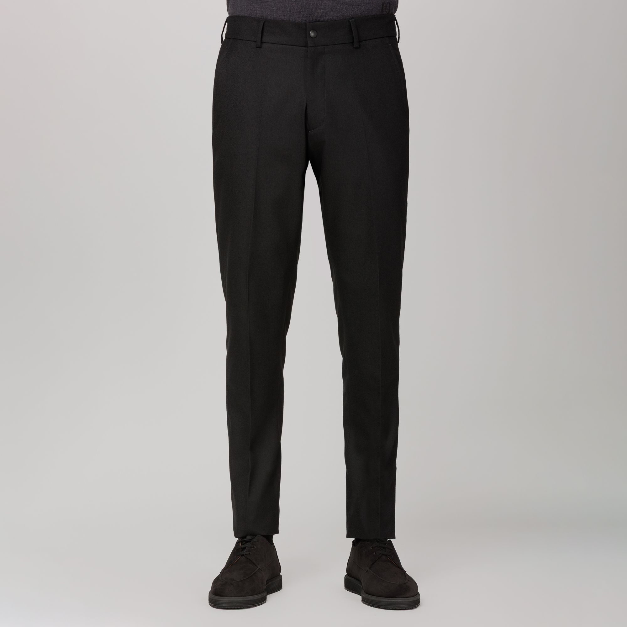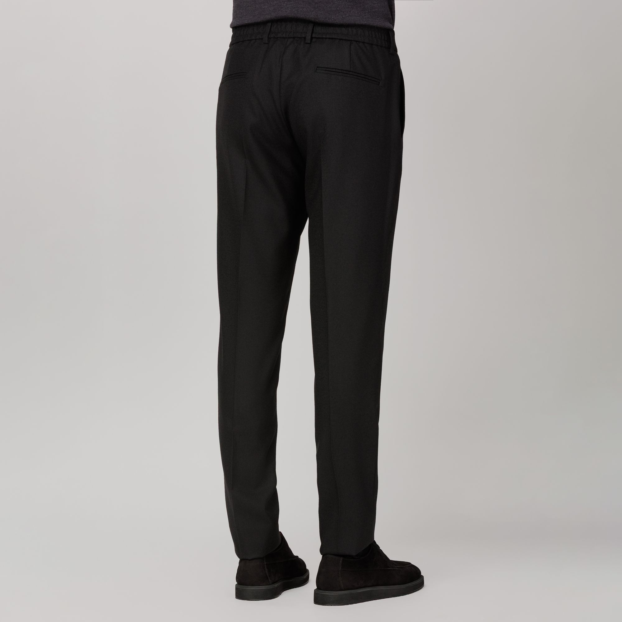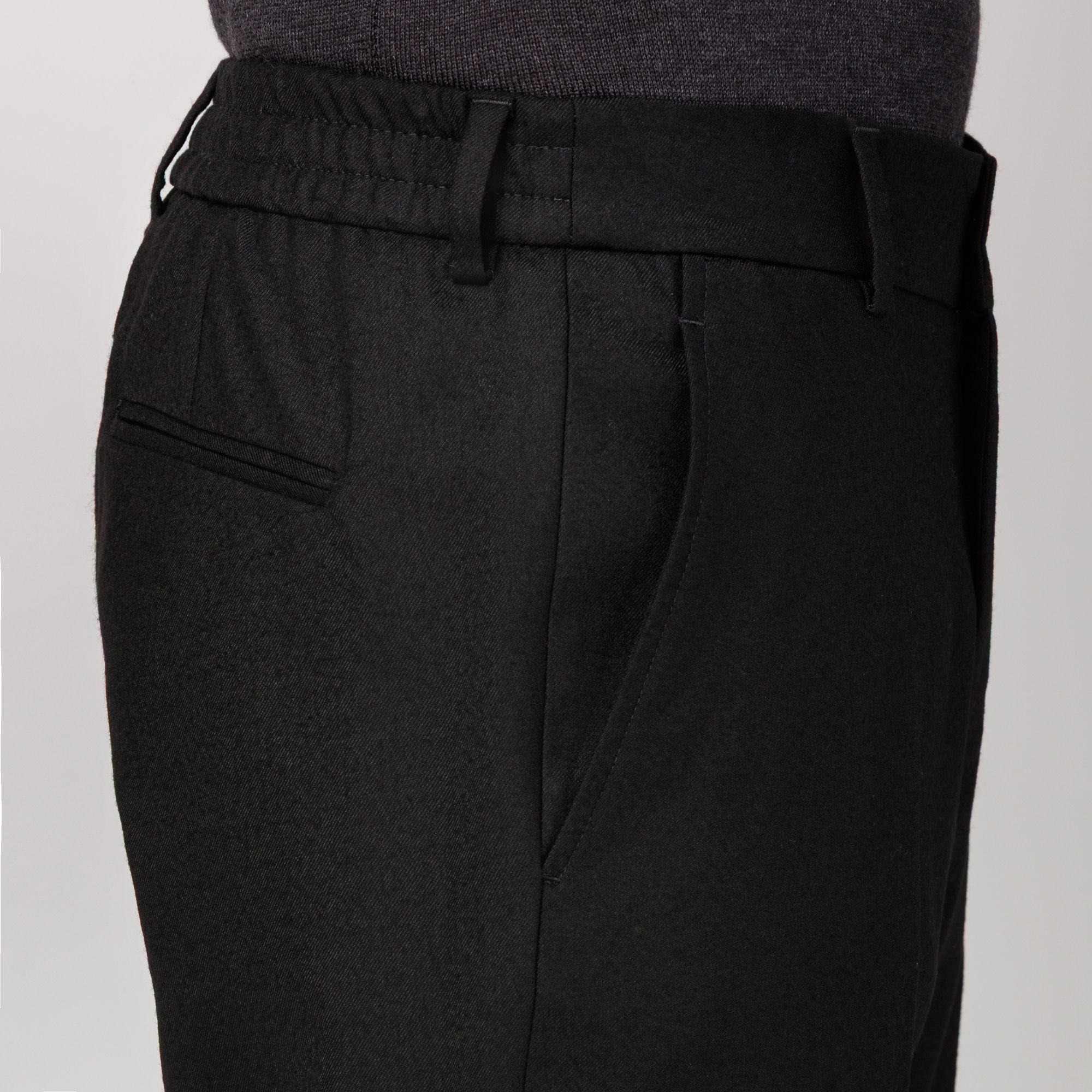 Eleganza discreta e funzionale. In flanella nera stretch, il pantalone con fronte liscio e vita elasticizzata posteriore coniuga agio e ordine. Chiusura con bottone e automatico, tasche oblique e tasche posteriori a filetto per una linea essenziale; piega stirata e passanti completano una silhouette pronta per l’ufficio e il tempo libero. Tessuto easy-care con mano morbida. Tessuto e confezione Made in Italy.