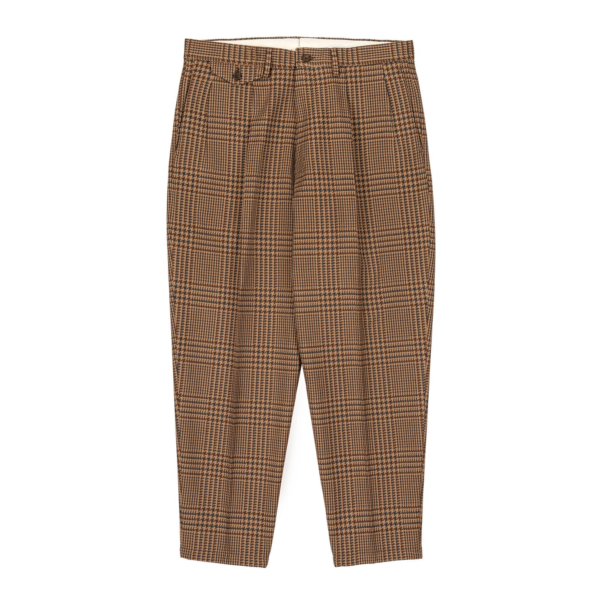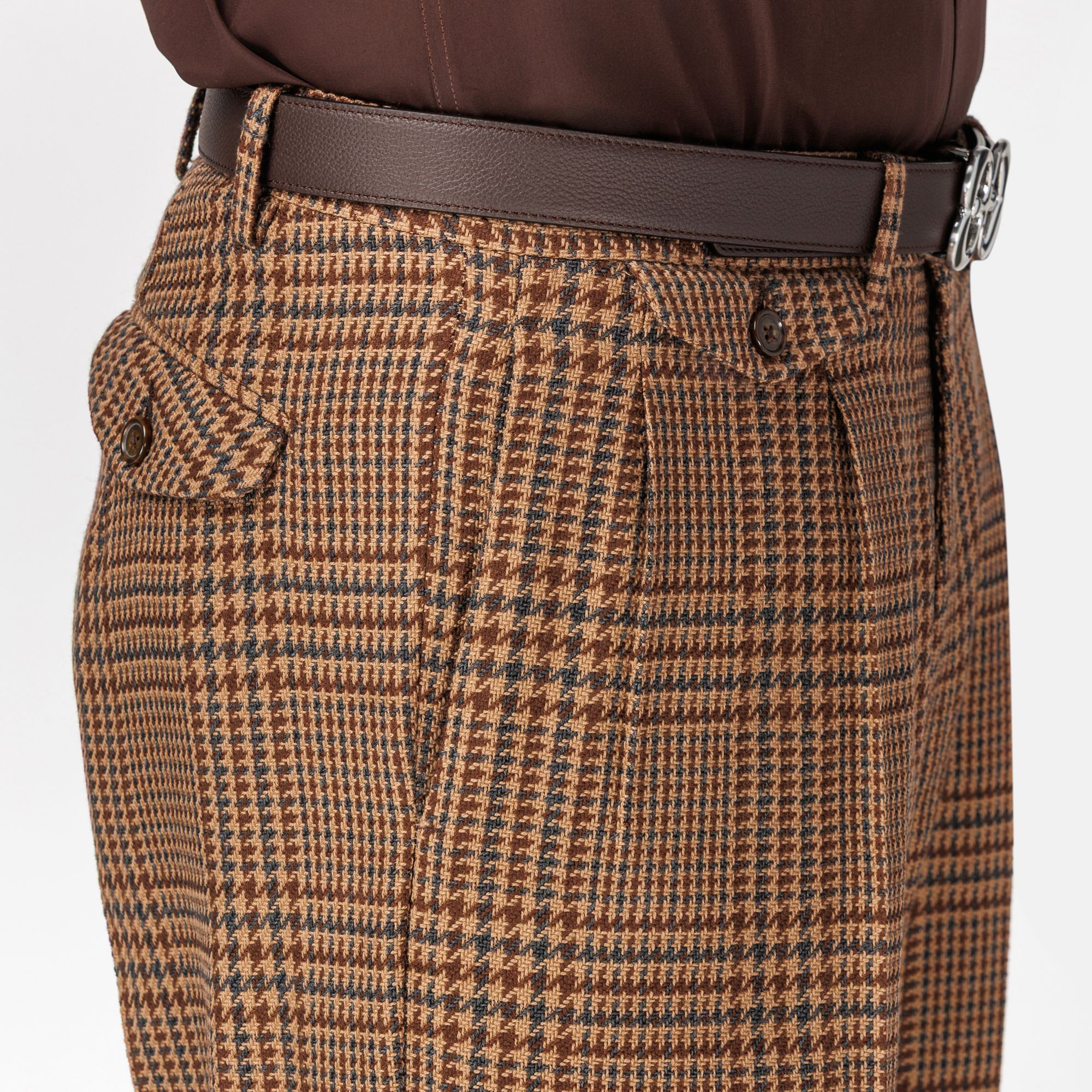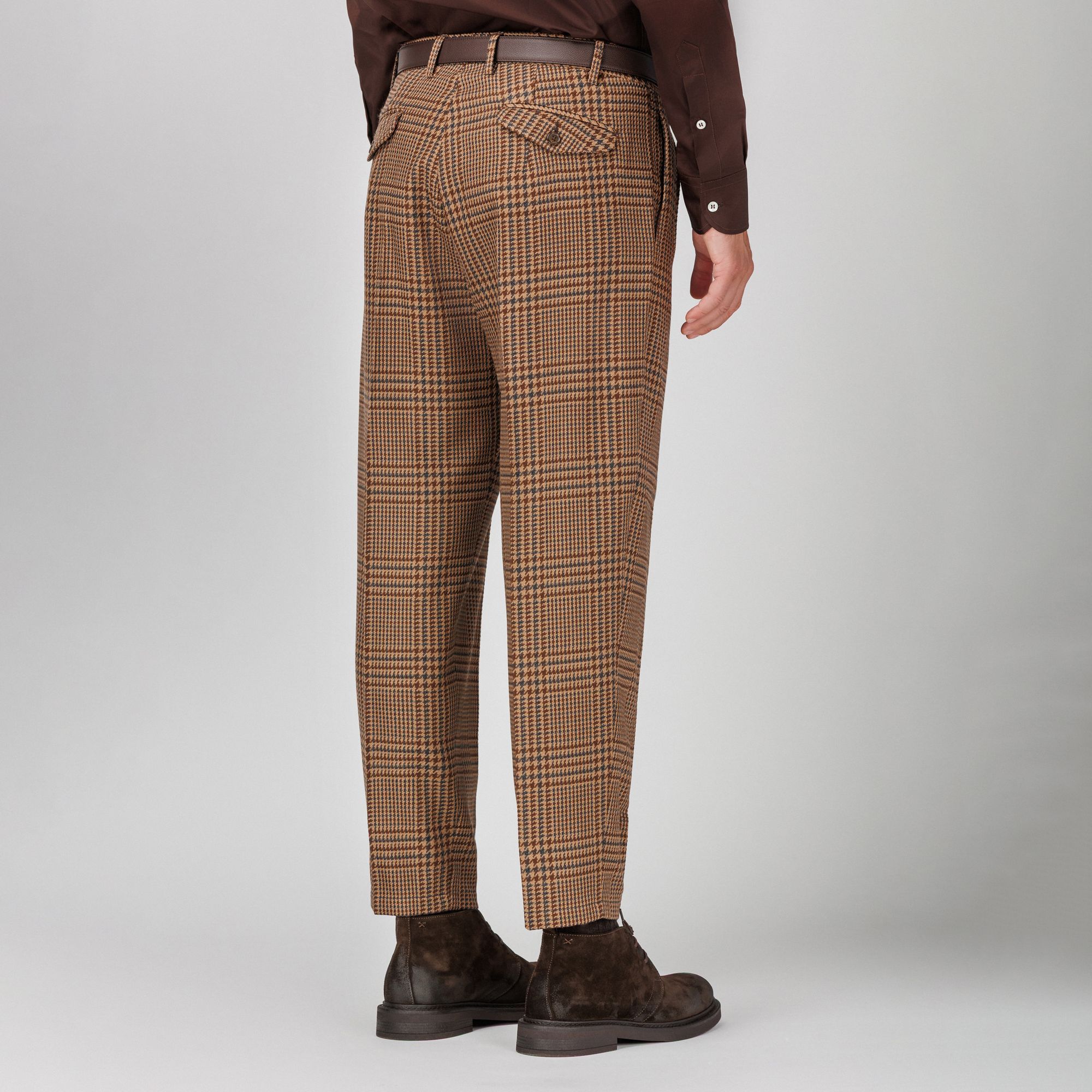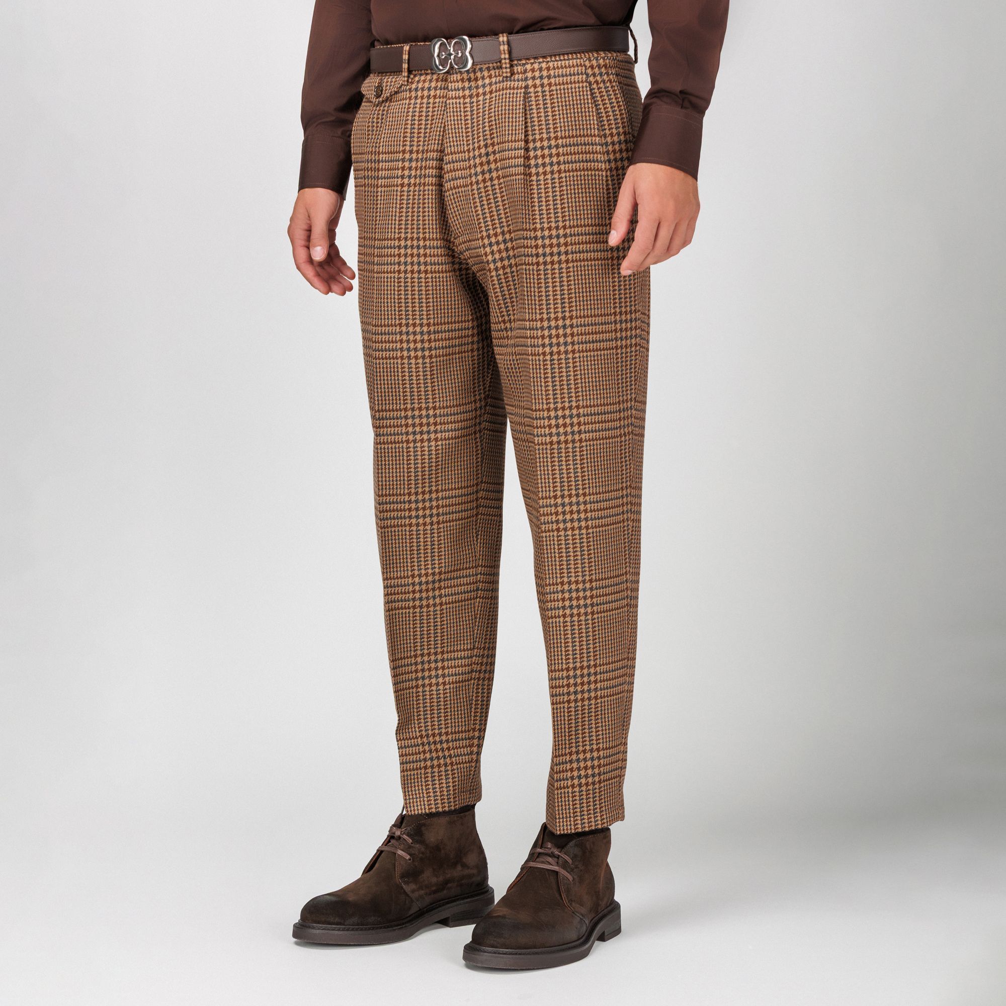 Pantaloni da uomo realizzati in blend di lana e cotone con disegno Principe di Galles nei toni del marrone. Linea sartoriale con fondo dritto e vestibilità regolare, uniscono la texture sportiva del cotone al lusso e al calore della lana. Eleganti e casual, perfetti per outfit versatili.