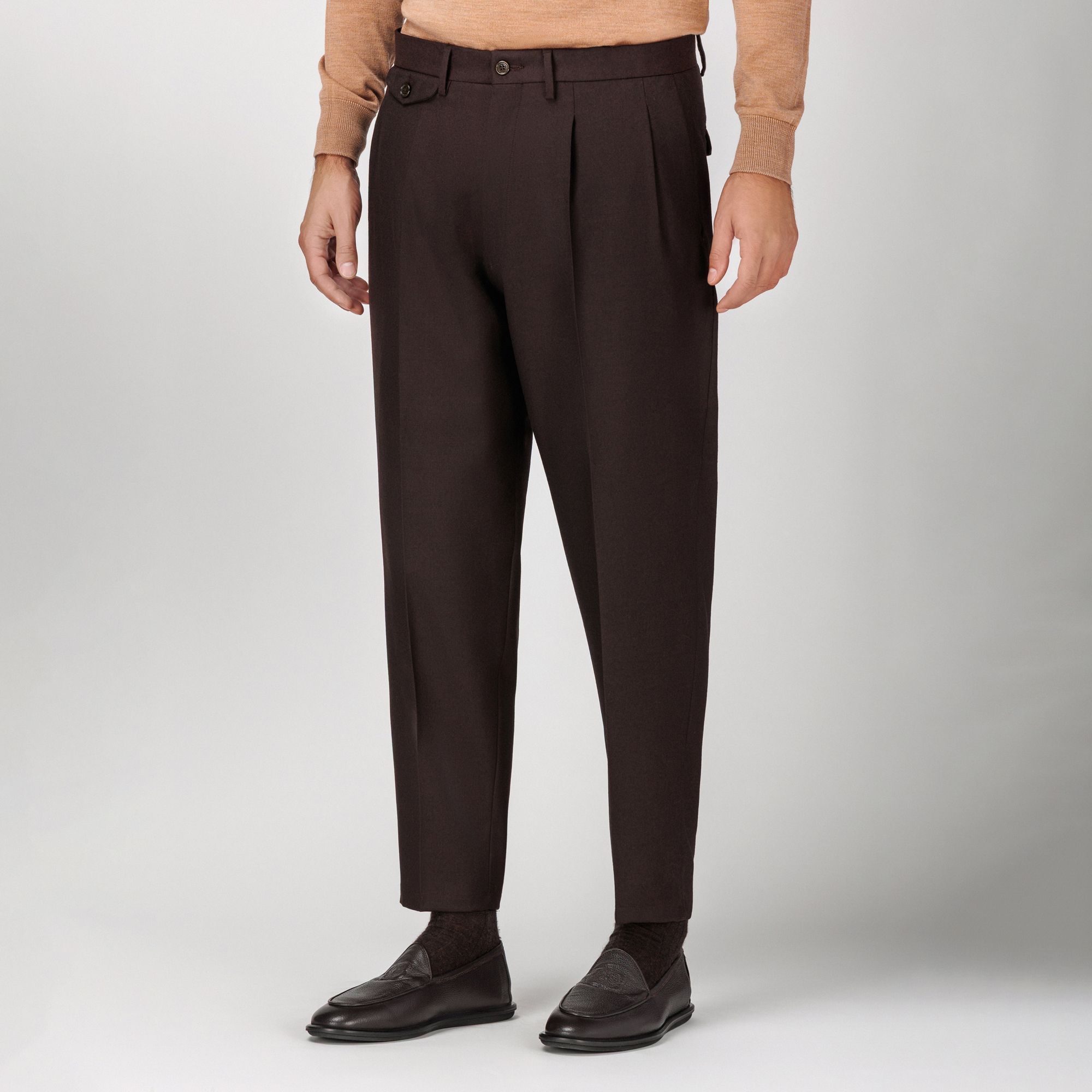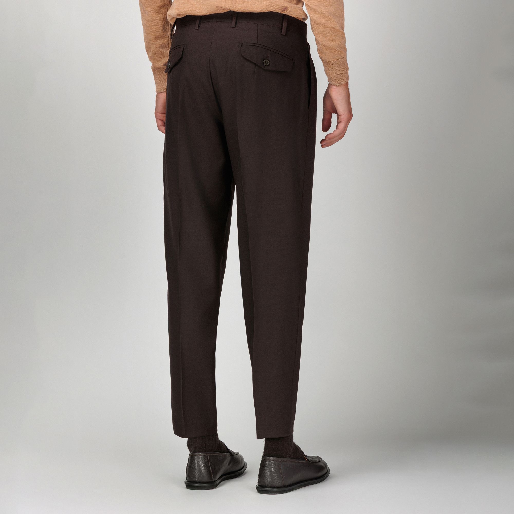 Pantaloni da uomo in flanella di lana mista, con vestibilità ampia strutturata e doppia pince. Modello Japan con tasche a pattina anteriori e posteriori e fondo pulito. Eleganza e comfort in perfetto equilibrio, lavabili e resistenti alle pieghe, fedeli alla filosofia Elio Evan di una calzata impeccabile.
