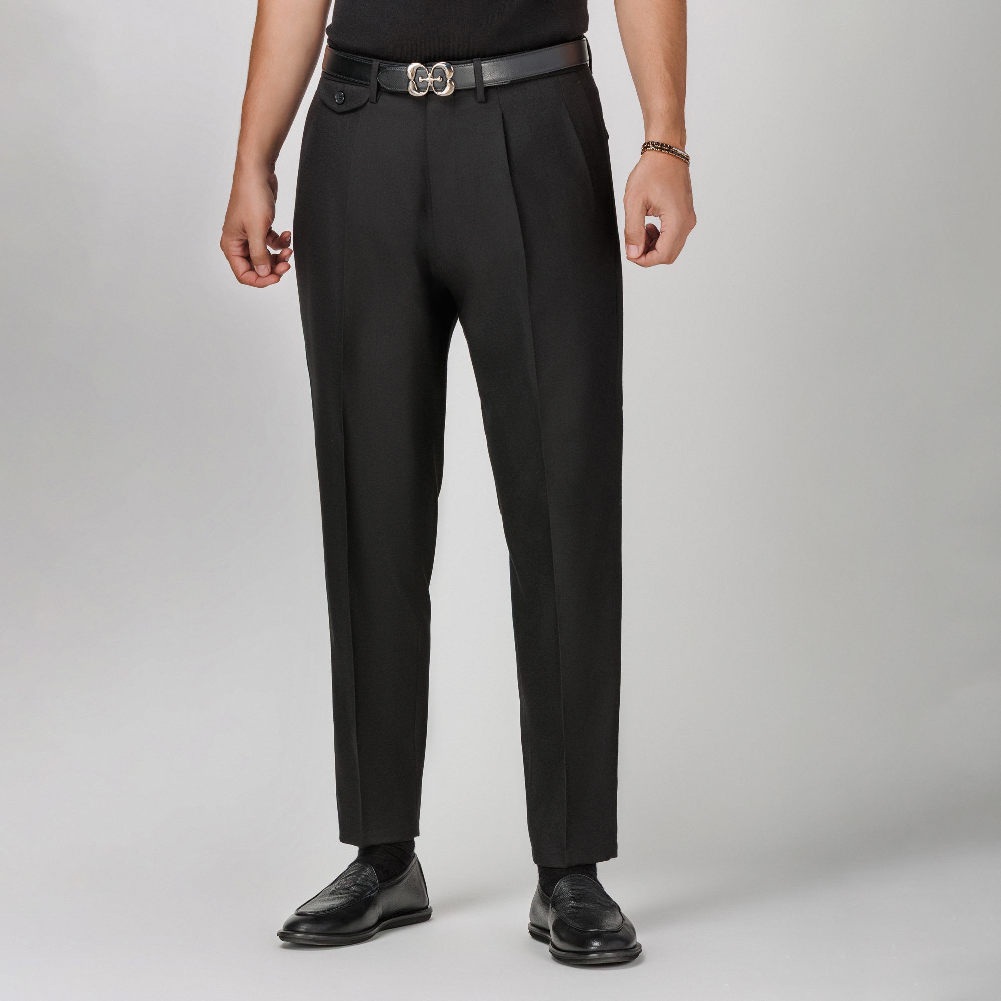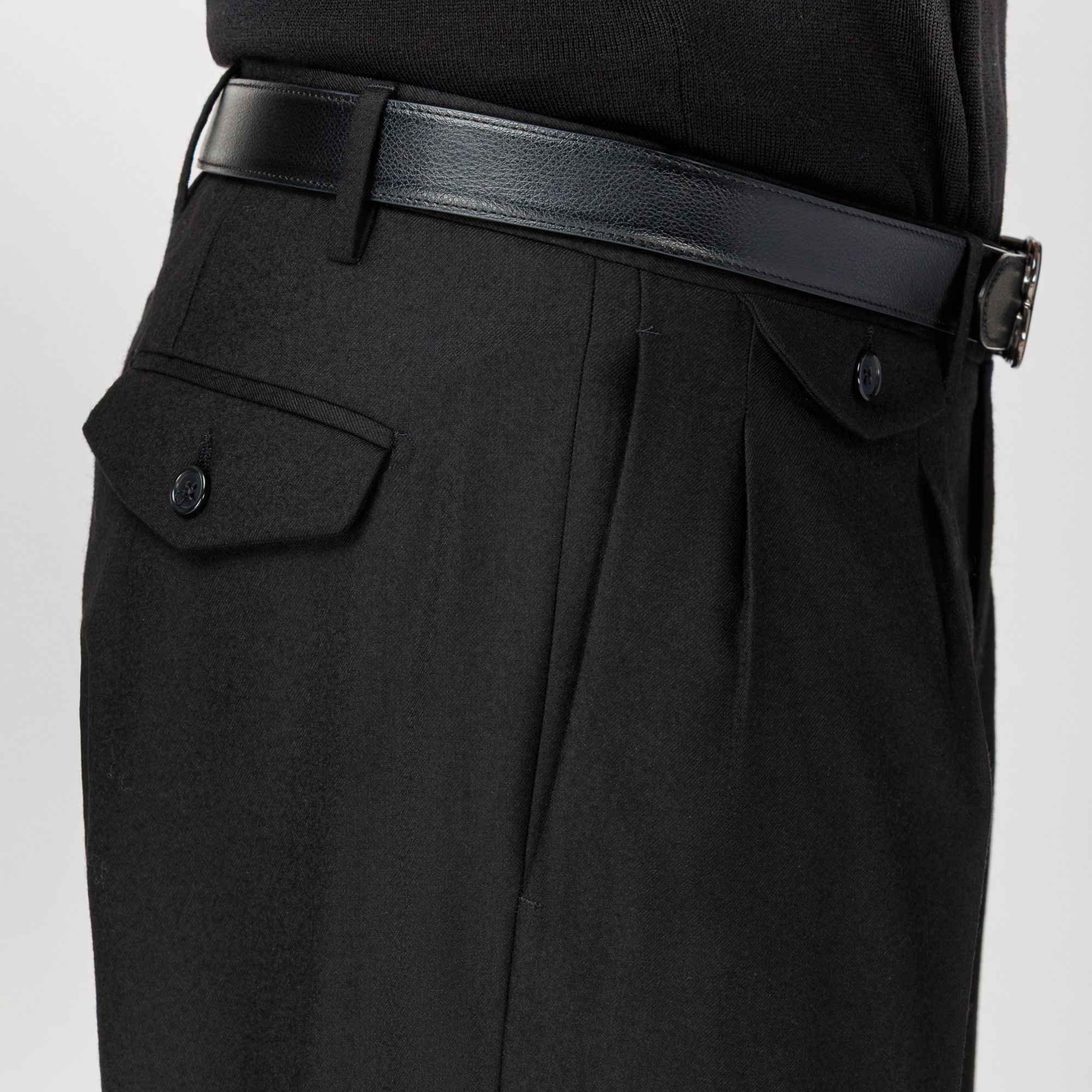 Pantaloni uomo neri in flanella di lana blend, che uniscono eleganza e funzionalità quotidiana. Il modello Japan presenta una calzata ampia e strutturata con doppia pince frontale, dettagli con tasche a pattina e cintura pulita. Lavabili, resistenti alle pieghe e versatili, combinano comfort con la vestibilità impeccabile firmata Elio Evan. Ideali per occasioni eleganti e look casual.